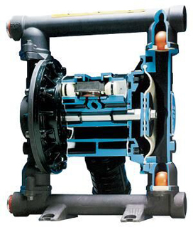 氣動雙隔膜泵采用壓縮空氣、氮?dú)饣蛱烊粴庾鳛閯恿ΑV鞫ㄏ颍鈩樱┛刂崎y將壓縮空氣分配至氣體腔室,向隔膜的內(nèi)表面上施加均勻壓力。同時排出的氣體從泵另一側(cè)后方通過氣閥組件導(dǎo)向端口排出。